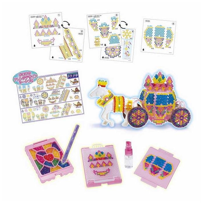 お水でくっつくアクアビーズを使って、いろんな作品をつくっちゃお!アクアビーズはビーズをビーズトレイに並べてお水をかけると、ビーズ同士がくっついて固まります。ビーズデザインを取り付けるだけで、簡単に豪華な立体の馬車を作ることができるオールインワンセットです。馬車は車輪や扉を動かすことができます。別売りのビーズでデザインの違う馬車が作れるアレンジデザインシート入り。