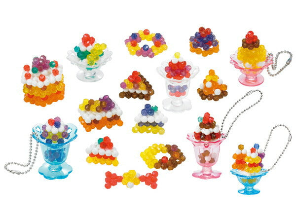 アクアビーズの別売りセットです。立体のパフェキーチェーンが作れます。グラスパーツが2種×3色の計6個入っています。