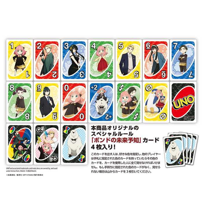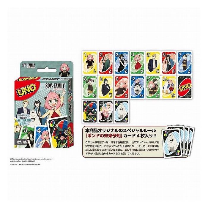 『SPY×FAMILY』のキャラクターやイラストを、ウノのカードデザインにしました。本商品オリジナルのスペシャルルールカードも4枚入って、一層楽しく、特別なウノに仕上がりました。