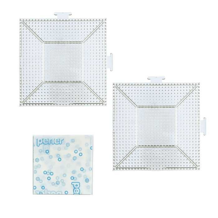パーラービーズ専用のプレートセットがリニューアル!●透明プレートにぴったりの爽やかなデザインに、創作意欲を刺激する色とりどりの作品をレイアウトしたラベルがポイント。●パッケージをブリスターからプラスチック袋に変えることで、パッケージサイズをスリム化し梱包材を削減。●図案シートに重ねて使える透明プレートは、子どもから大人まで幅広い年齢の方にお手軽にお楽しみいただけます。また、プレートどうしをつなげることができるので、たくさんのプレートを使って大きな作品を作れます。【セット内容】プレートL 四角形(透明)×2、アイロンペーパー×1