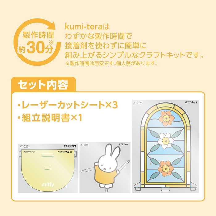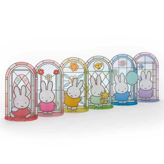 組み立て簡単、接着剤不要の「クミテラ」 ステンドグラスシリーズにミッフィーが登場!●ミッフィーとお花をモチーフにしたステンドグラスデザインのクラフトキット。淡い色合いと透明感がポイントです。●印刷された透明のプラスチックシートからパーツを取り外して組立てるだけ。誰でも簡単に組立てることができます。●照明・ライト、また窓際など自然光の当たる場所に飾ると光に照らされたステンドグラスデザインを楽しめます。●別売のLEDプレートを使用すれば、暗いお部屋でも色鮮やかにライトアップが可能です。●レッド・ピンク・イエロー・グリーン・ブルー・パープルの全6種同時発売。