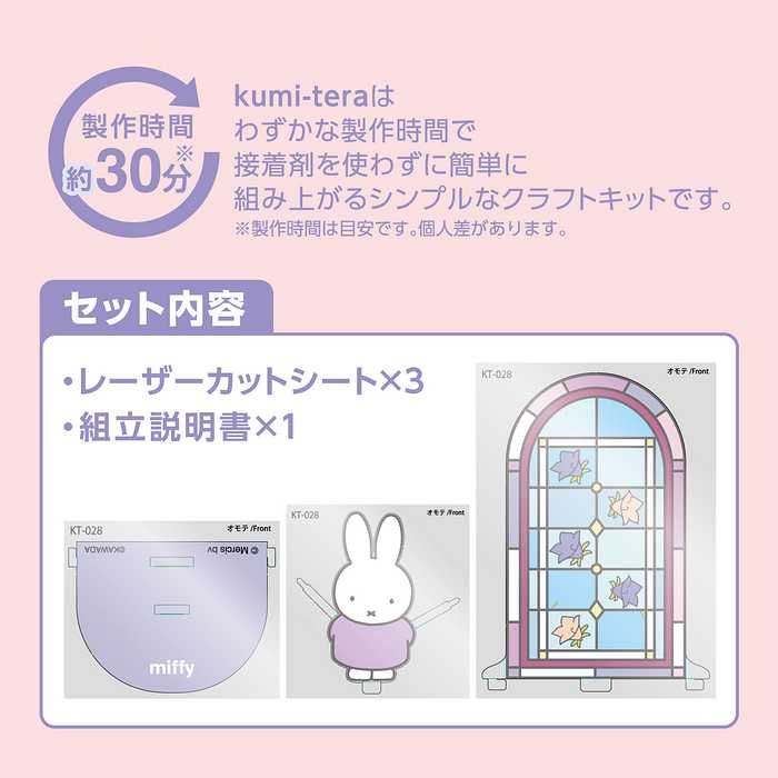 組み立て簡単、接着剤不要の「クミテラ」 ステンドグラスシリーズにミッフィーが登場!●ミッフィーとお花をモチーフにしたステンドグラスデザインのクラフトキット。淡い色合いと透明感がポイントです。●印刷された透明のプラスチックシートからパーツを取り外して組立てるだけ。誰でも簡単に組立てることができます。●照明・ライト、また窓際など自然光の当たる場所に飾ると光に照らされたステンドグラスデザインを楽しめます。●別売のLEDプレートを使用すれば、暗いお部屋でも色鮮やかにライトアップが可能です。●レッド・ピンク・イエロー・グリーン・ブルー・パープルの全6種同時発売。