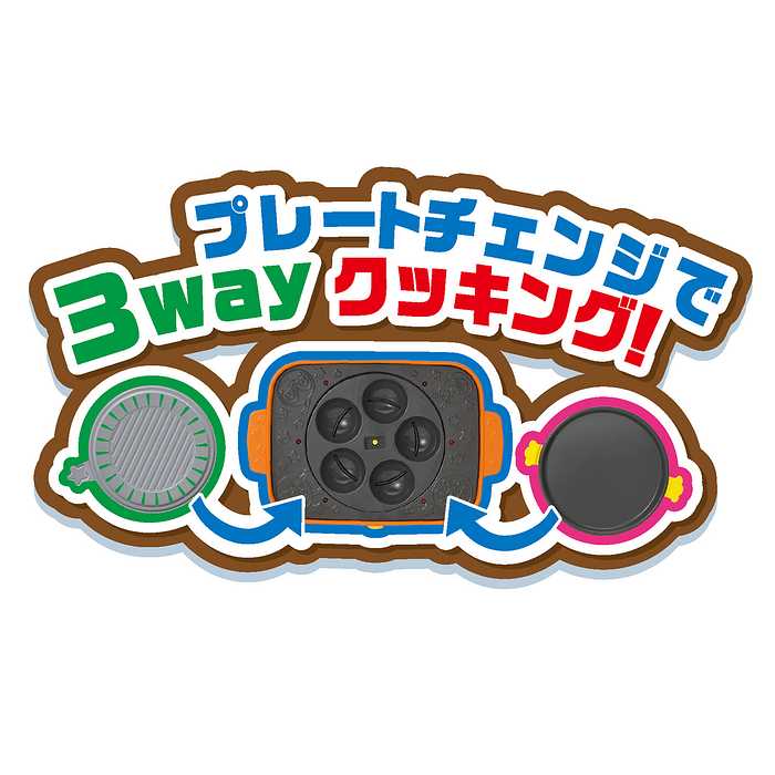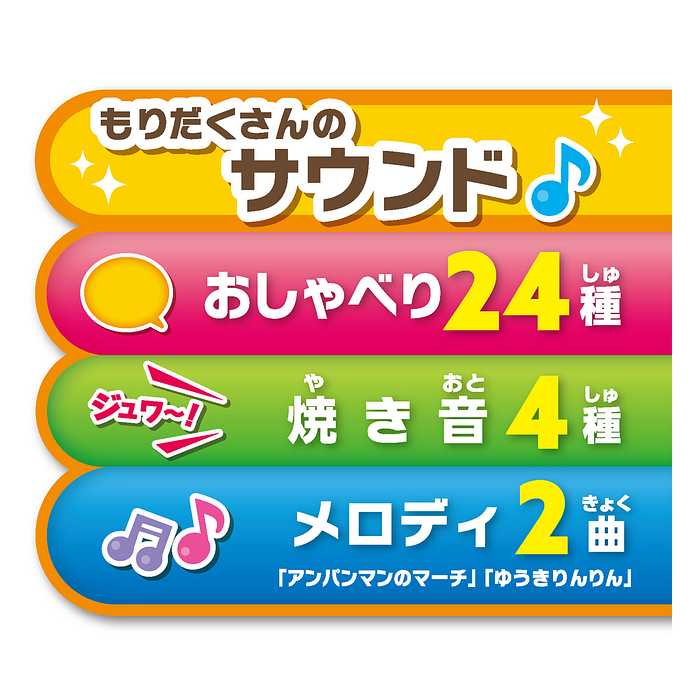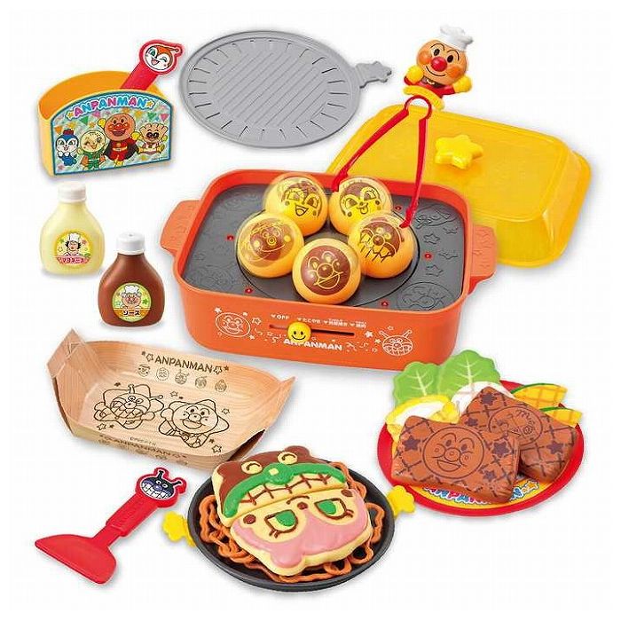 プレートチェンジで3wayクッキング!たこやき、鉄板焼き、焼肉、いろいろ遊べるアンパンマンのホットプレート!レバーをスライドしてモード切り替えができます。3つのプレートを付け替えて遊びましょう。おしゃべりとメロディが流れ、プレートが光って揺れるよ!たこやきモードはプレートの上でたこやきがゆらゆらダンス!トングでたこやきをつかんで舟皿に盛り付けよう!鉄板焼きモードはおこのみやき、焼きそばをのせてヘラで押すと「ジュー!」、お皿に盛り付けてできあがり!お好み焼きはヘラでザクっと半分に切れ、やきそばはフォークですくえるよ。焼肉モードはお肉をのせてトングで押すと「ジュワ?!」、お肉はひっくり返すとアンパンマンとメロンパンナちゃんの焼き目に変わるよ!アンパンマン、ばいきんまん、ドキンちゃんの楽しいおしゃべりは全部で24種類、焼き音は4種類、メロディは「アンパンマンのマーチ」「ゆうきりんりん」の2曲が流れます。トング、ヘラ、フォークはツールスタンドにお片付けできます。