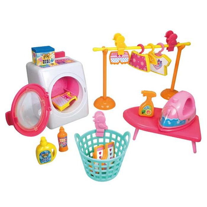 洗濯機にカゴ、アイロンとアイロン台、せんたくものを干すこともでき、かわいい洗濯バサミ等も入ったおせんたくセットです。ボタンでドラムがまわります。
