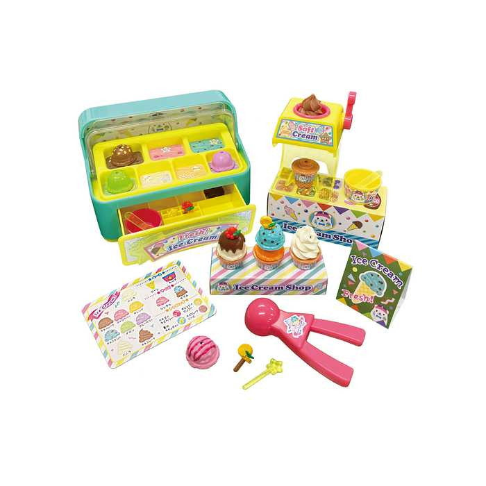 ショーケースが開け閉めできるキュートなアイスクリームショップのセットです。ディッシャーやソフトクリームサーバーを使ってショップ店員さんになりきろう!コーンやカップにカラフルなアイスをのせてかわいくトッピングしよう!