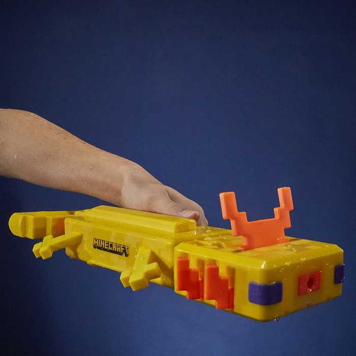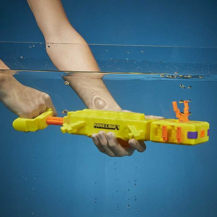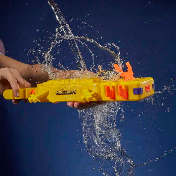 大人気ゲーム「Minecraft」に登場するキャラクターをモチーフにしたウォータブラスターです。ブラスターの前部を水に浸して、ハンドルを後ろに引いてタンクに水を入れてからハンドルを前に押すと水が発射されます。ブラスターの上部と側面には、動くエラが付いていて、ポーズをとることができます。※対象年齢8才以上。ゴーグル着用を推奨(別売)。セット内容:ウォータブラスター