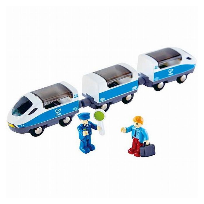 さあ、みんな乗って!運転士はもちろん、荷物の多い乗客も、みんなが乗れる大きな電車です。マグネットの連結部分で車両をつないで、みんなを目的地まで連れていってあげよう。電車は全車両のふたが開きます。中に運転士や乗客を乗せて、さあ出発!ハペの全レールシリーズとあわせて遊ぶことができます。