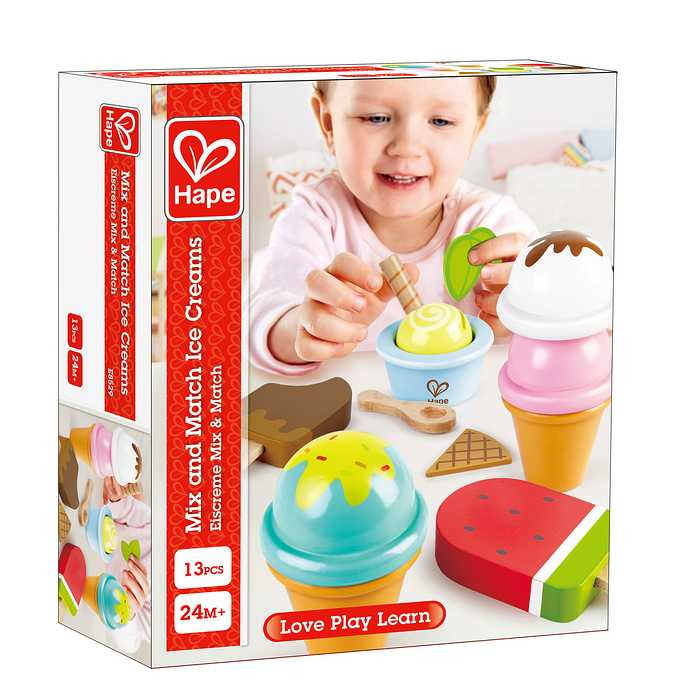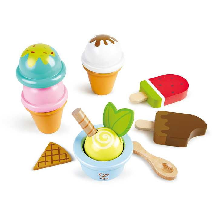 ■パーツを組み合わせて自分だけのアイスクリームセットをつくろう!■コーンが2つとその上に乗せる異なるフレーバーのアイスクリームが3つ付いています。■カップに入ったアイスクリームにはトッピングが3種類とスプーンが付いています。■かわいいスイカのアイスバーとチョコレートのアイスバーも入った大満足のセットです。