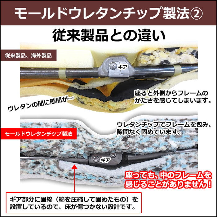 日本のマットレス工場で職人が1点ずつ丁寧に作り上げた商品です。中材はチップウレタンフォームを使用。