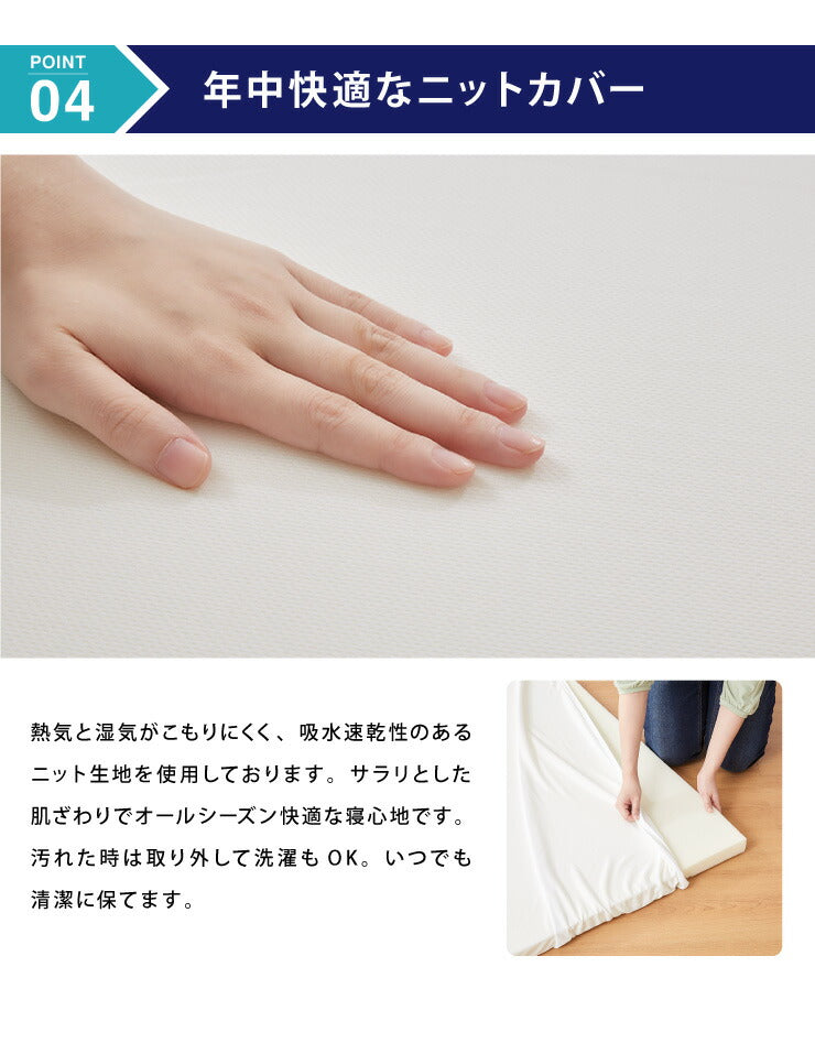 高密度で低反発のウレタンで寝心地アップ。柔らかな寝心地で体圧分散を促進します。ニット生地を使用。
