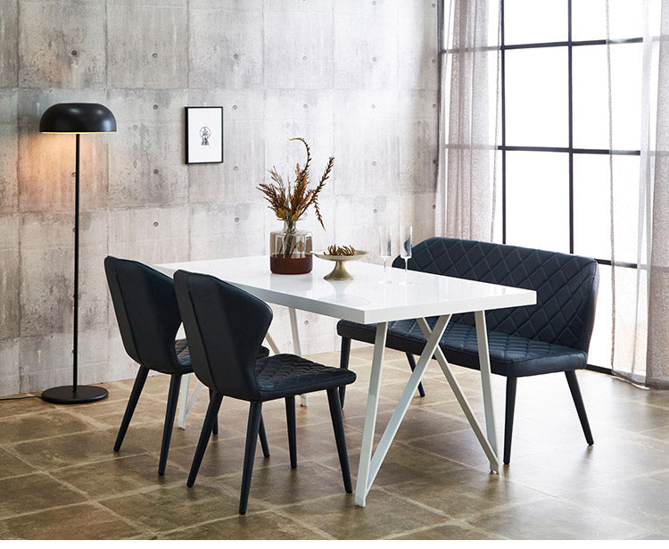 清潔感のあるホワイト鏡面仕上げのダイニングテーブルとカジュアルモダンなダイニングセット。