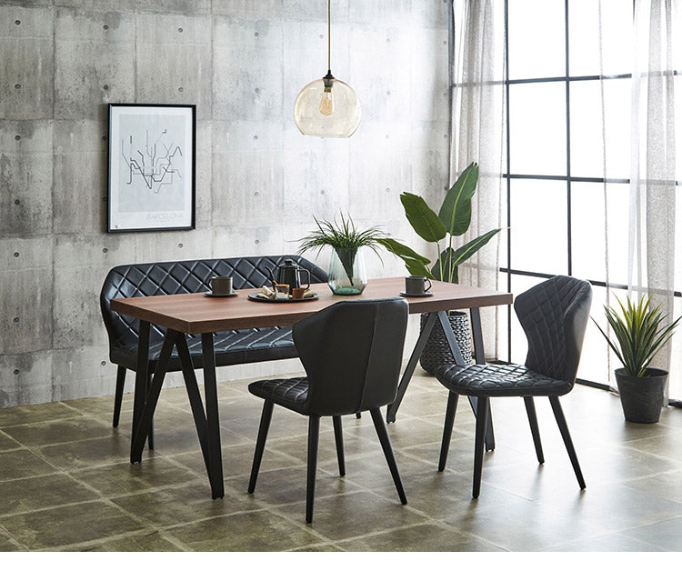 インダストリアル系のカジュアルなダイニングセット。背もたれ付きのベンチは高級感があります。