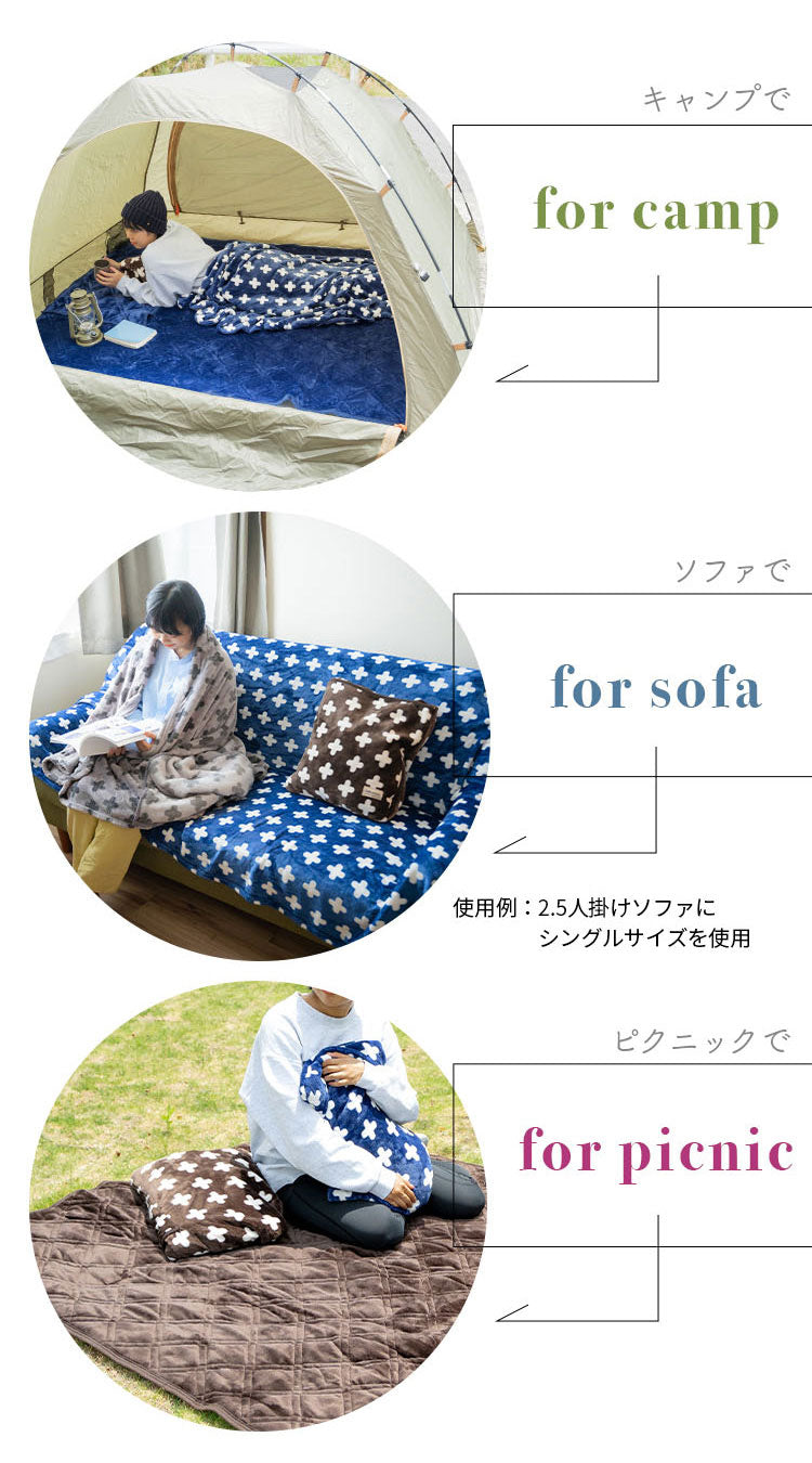 ブランケットとしてもクッションとしても使え、ポケットには“湯たんぽ”や“足”を入れたり好みの暖かさに。
