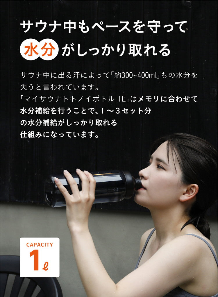 サウナ中に出る汗の量は、「300~400ml」の水分を失うとされています。サウナ中にペースを守って水分補給ができる「tomte(トムテ)マイサウナトトノイボトル1L」