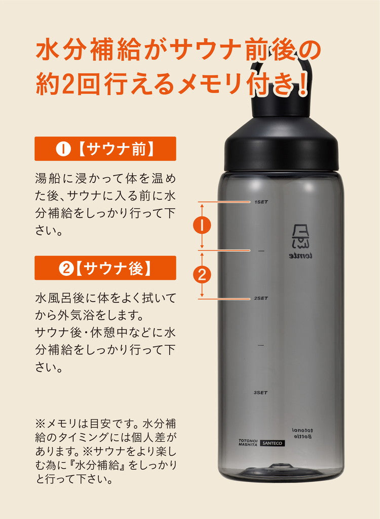 ボトル本体には水分補給量の目安になるメモリがあり、湯船に浸かって体を温めた後、サウナに入る前、サウナ後、休憩中など、しっかり水分補給を行ってください。