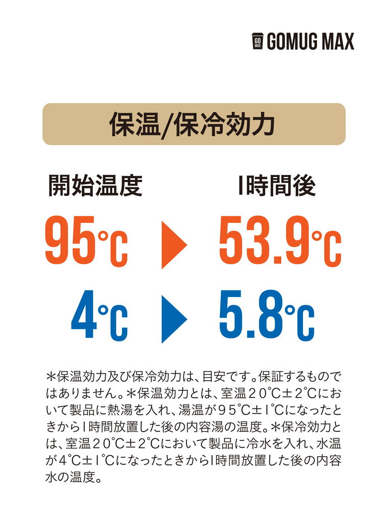 保温効力:53.9℃(1時間)、保冷効力5.8℃(1時間)