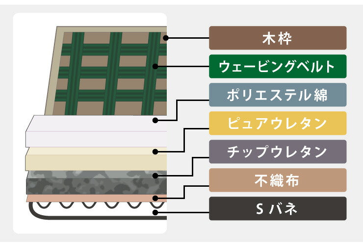 クッション部分:ウレタンフォーム、シリコンフィル、Sバネ、ウェービングベルト、ポリエステル、綿