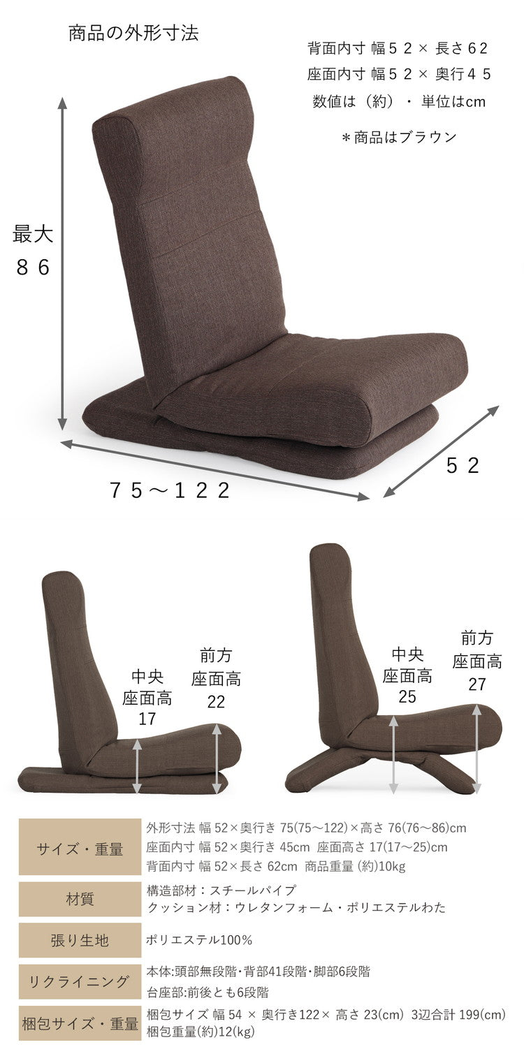 外形寸法(約) 幅52x奥行き75(75~122)x高さ76~86cm 座面高さ17~25cm /座内寸幅52x奥行き45cm/背内寸幅52x長さ62cm/重量(約)10kg