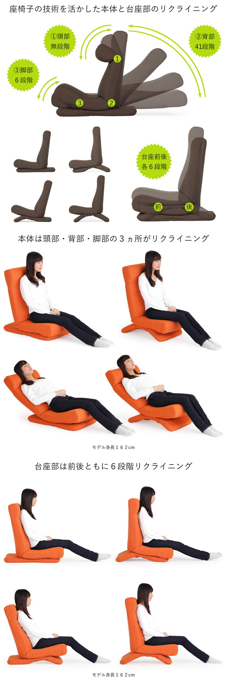 本体は頭部無段階・背部41段階・脚部6段階の3ヵ所、台座部は前後6段階の2ヵ所がそれぞれリクライニング。