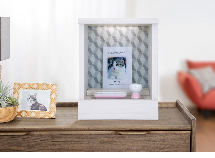 ペット向けの本格仏壇。家族同様に大切なペットをご供養していただけます。LED照明が背面のアクリル板の裏から間接照明のようにほんのりと明るく照らします。