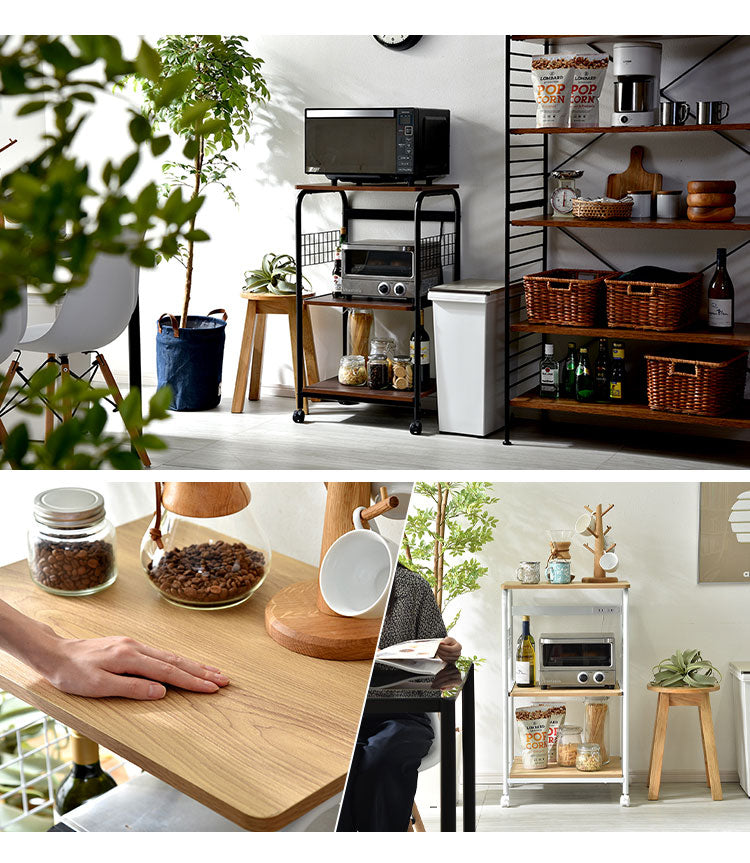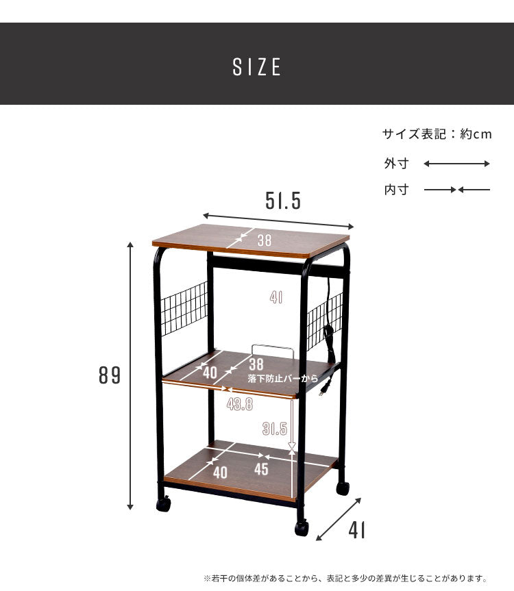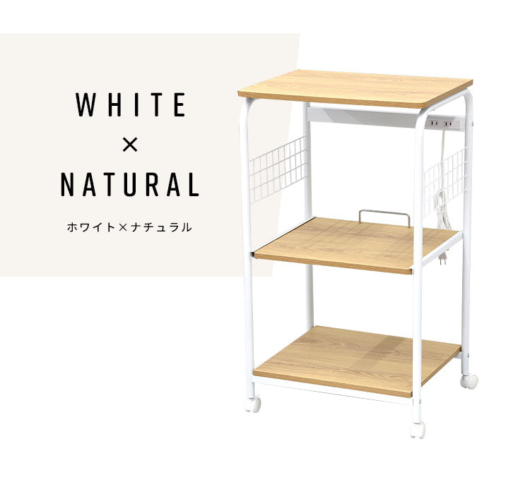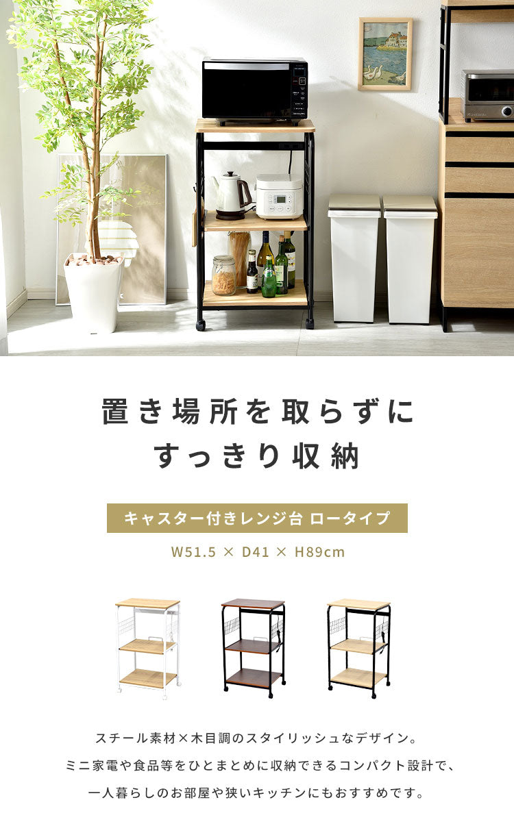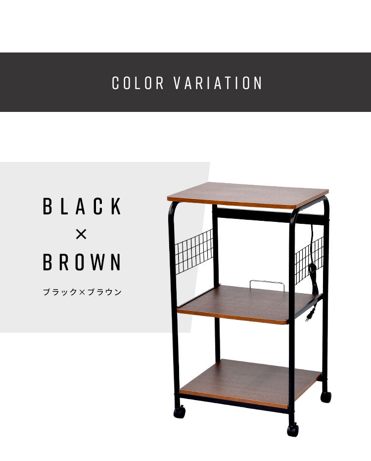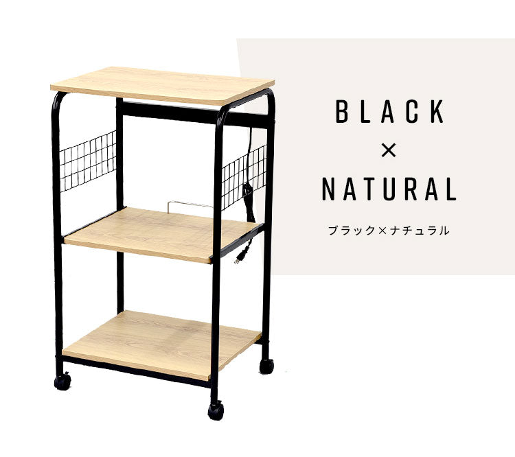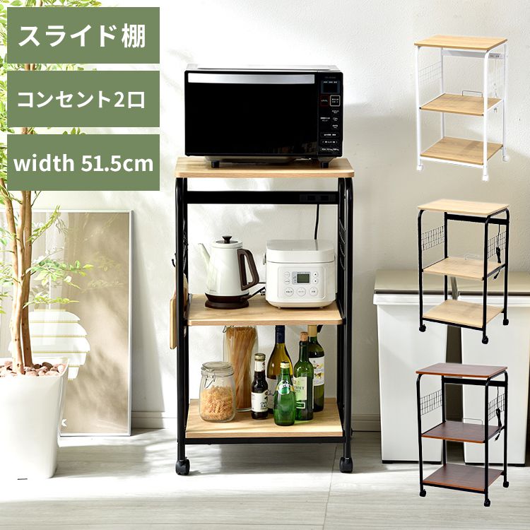 キャスター付きレンジ台 ロータイプ 50幅 3段 コンセント付 スライド棚 ワイヤーメッシュ付 スチール 木目調 ブラック ブラウン ナチュラル おしゃれ 北欧 キッチン収納 家電収納 レンジ台 レンジラック (代引不可)