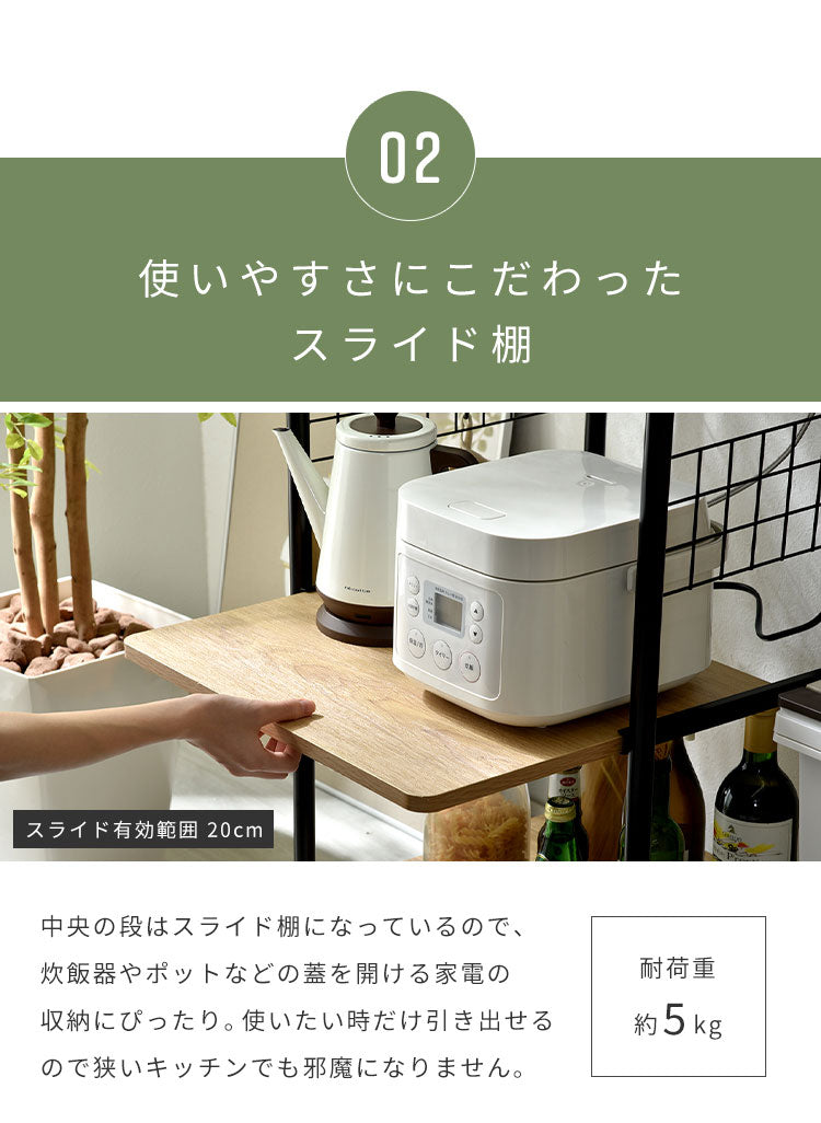 ・真ん中の段はスライド天板になっており、炊飯器など蓋を開ける家電の収納にピッタリです。