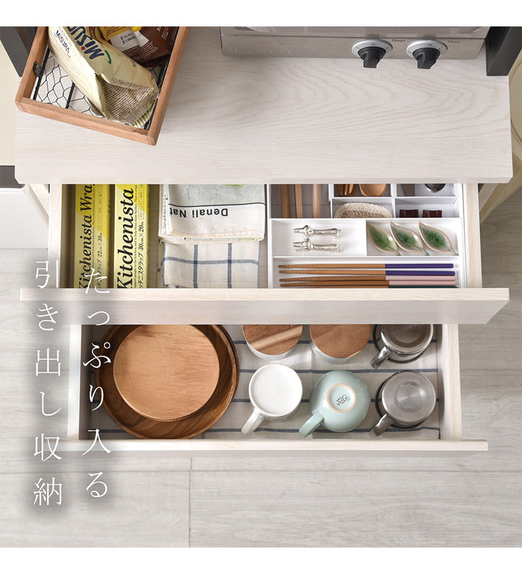 ・引き出しが2杯ついており、箸などの食器の収納に適しています。