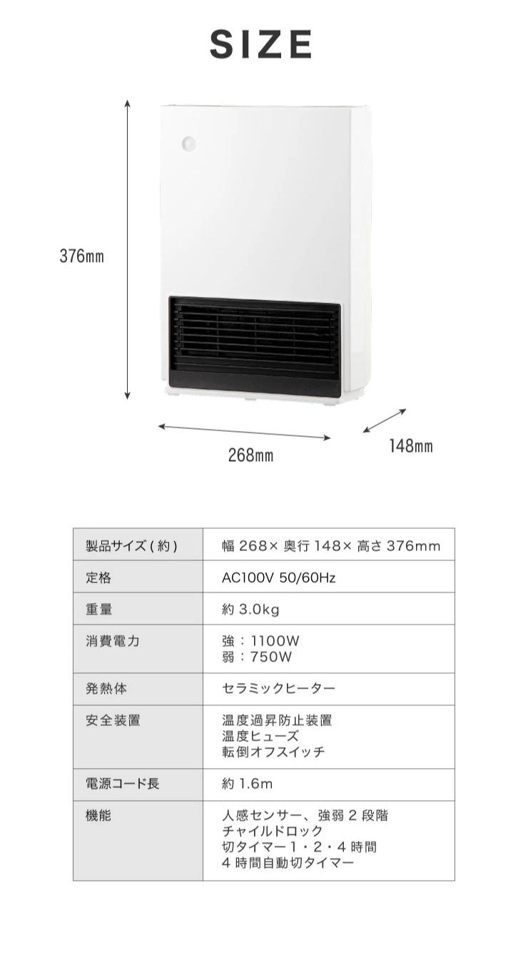 セラミックヒーター 人感センサー付き 温度センサー付き 自動運転 電気 ファンヒーター 温風 オフタイマー 自動 切タイマー
