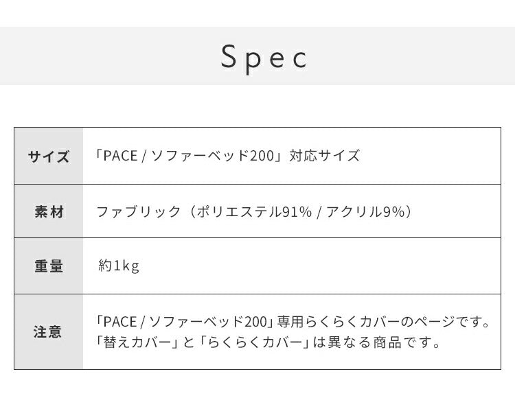 「PACE / ソファーベッド200」専用らくらく替えカバーのページです。