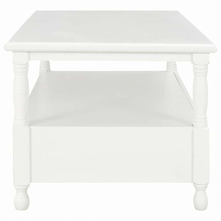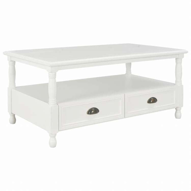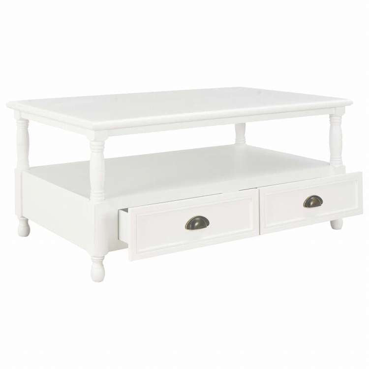 ■このスタイリッシュな木製のコーヒーテーブルで、エレガントなタッチを添えましょう。ホワイトカラーのラッカー仕上げが特徴です。このコーヒーテーブルは引き出し2つとオープン収納コンパートメントを1つ備えており、十分な収納スペースがあります。優れた職人の技が印象的で、リビングのインテリアをあっという間にアップグレードします。 飲み物や、その他ちょっと必要なものが置ける、しかも収納スペースもついている、そんなテーブルをお探しの方には、このコーヒーテーブルがぴったりです。引き出し2つとオープン収納コンパートメント1つを備えており、雑誌や本といったリビングスペースに必要なものが、すっきり収納できます。現代的なデザインが、お部屋の空間を素敵に演出します。MDF、無垢のパインウッドとユニークな桐ベニアで作られているから、年数問わずお使い頂けます。