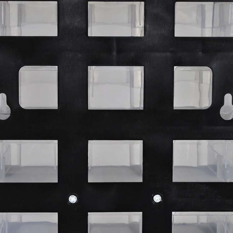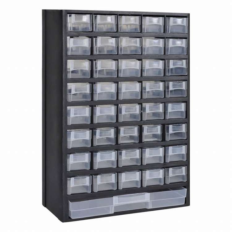 ■41個の引き出し付きのプラスチックツールボックス。40個の小さな引き出しと大きな引き出しで作業領域を整理するに大活躍に間違いなし。小型の機械部品、アクセサリー、DIY作品など、あらゆる種類の小物を保管するのに最適です。ものの大きさに応じて、大きな引き出しと小さな引き出しのどちらかをお選びいただけます。耐久性のある透明なプラスチックが、引き出しに収納されているアイテムがはっきり見えます。ボックスの背面には、壁やその他の表面に固定できる2つの小さな穴があります。