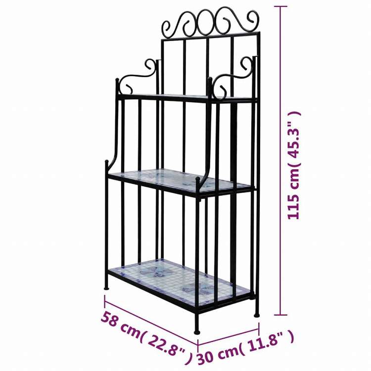 ■この植物スタンドは、エレガントにカーブした鉄製フレームと3段のモザイク柄セラミックトップで構成されています。お庭やバルコニー、テラス等の注目を集めるアイテムになるでしょう。 高さ115cmの3段式プラントラックは、どんな壁にもぴったりと設置できます。アイアン製のフレームは頑丈で、セラミック製の天板はお手入れも簡単です。長年の使用に耐えられる、耐久性も備えています。この製品は寒冷地での使用には適していませんのでご注意ください。