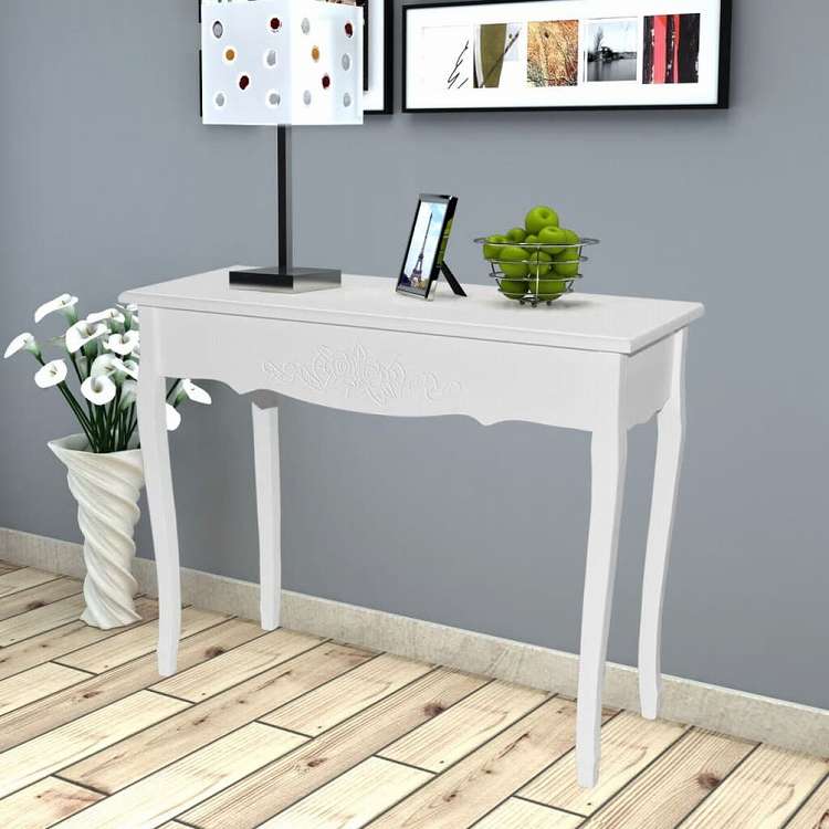 ■シンプルながら飽きないデザインのコンソールテーブル。リビング、ダイニングルーム、廊下などにぴったり。 職人技が光る設計のテーブルは、非常に機能性に優れています。コンパクトデザインは、スペースをほとんどとらず、こぢんまりとしたお部屋や空間にぴったり。花柄は、デザイン性をさらに惹き立てます。 このドレッシングテーブルは、高品質のMDFとパイン材でできており、耐久性を高めるためにホワイト塗装仕上げが施されています。長年ご使用できる作りです。