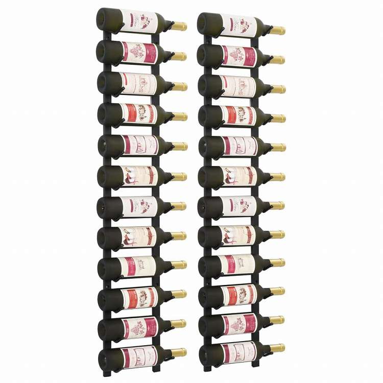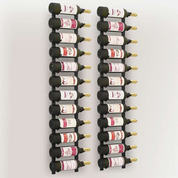 ■壁掛けタイプのワインラックです。お気に入りのワインをスッキリ収納するのにお勧めです。インテリアをあっという間にスタイリッシュに引き締める、ハイエンドの魅力たっぷり。 このワインラックは2点セットで、最大24本のワインボトルを一気に収納できます。シンプルながらスタイリッシュなデザインで、モダンで上品な空間に演出しましょう。ワイン好きのお友達やお知り合いへの素晴らしい贈り物としてもぴったり。粉体塗装仕上げの鉄を使用し、耐久性抜群です。このワインスタンドは、取り付け器具付きで、組み立てが簡単です。 ボトルは本製品に含まれませんのでご注意ください。