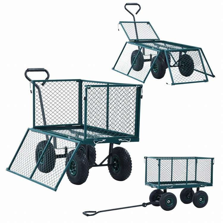 ■耐久性が高く、スチール構造が特徴の手押し車です。様々な園芸作業に最適。 頑丈なスチールで出来たこのガーデンカートは、安定性と耐久性に非常に優れています。最大積載量は350kgで、花や葉、丸太、その他の物資の運搬が簡単に行えます。サイドパネルはクイックリリース式のファスナーを使って開くことができ、荷物の積み下ろしが簡単にできます。また大型の空気圧式ホイールを採用しているため、安定性のない凸凹の不整地であっても、楽に引くことができます。パッド入りのハンドルでしっかりと握ることができます。 お子様を乗せて使用するトローリーではなく、その目的での使用には適していませんのでご注意ください。手押し車用のライナーはお届けに含まれていませんが、同ショップ内でご購入頂けます。