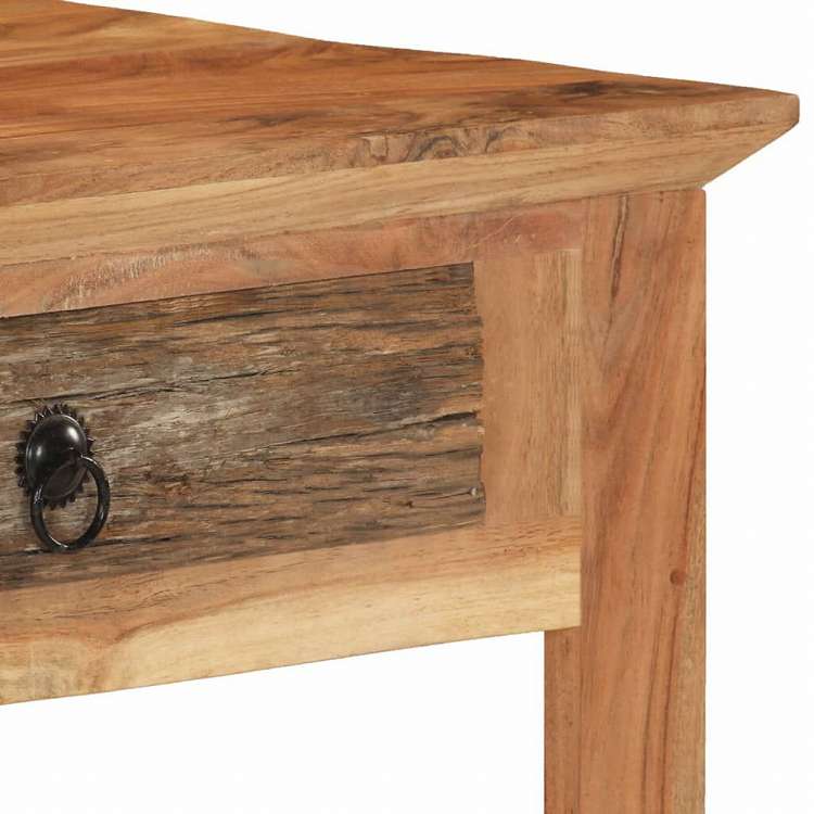 ■素朴な魅力を醸し出す個性的な木製のデスク。お家やオフィスで目を引く存在となるでしょう。 このライティングデスクは再生無垢材で手作りされているため、一点一点が個性を持ち、少しずつ異なる表情を見せてくれます。再生無垢材は頑丈で、安定しており、耐久性があるだけでなく、美しさを備えています。摩耗の味わいとくっきりとした木目構造は、各作品に独自の経年感と独特の外観を与えています。無垢のアカシア材のフレームは、デスクの安定性を高めています。デスクには、アイテムを整理して手の届くところに置いておくための十分な収納スペースを持つ引き出し2点が備わっています。コンソールテーブル、ホールテーブル、サイドテーブルなどとしても使用できます。 重要事項:自然素材を使用しているため、色と木目は商品毎に異なり、1点ものとなります。ランダム発送でお届けします。