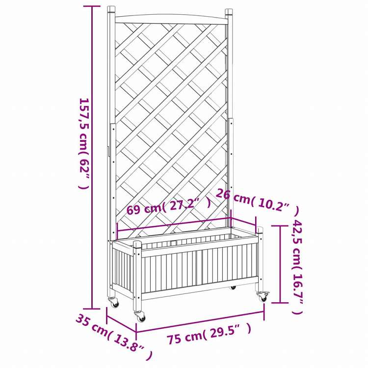 ■トレリスとキャスターが付いたこの木製プランターは庭やパティオ、テラスでつる性の植物を育てるのにぴったりです。 モミ無垢材:モミ無垢材は、湿気にさらされても完全性を維持する美しく耐久性のある素材です。乾燥や反りがないので、信頼できる素材です。