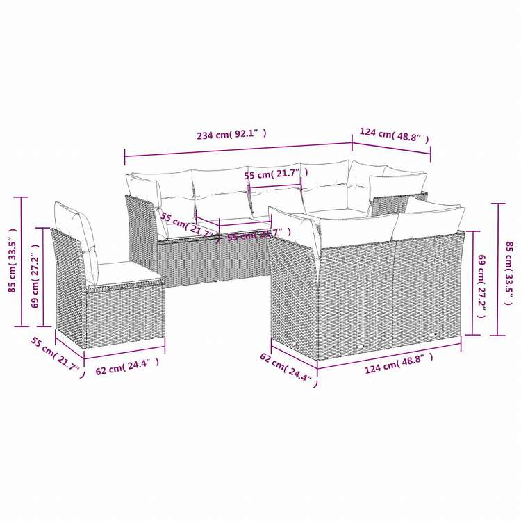 ■5人掛けソファ全体サイズ:234 x 124 x 69 cm (幅 x 奥行き x 高さ)